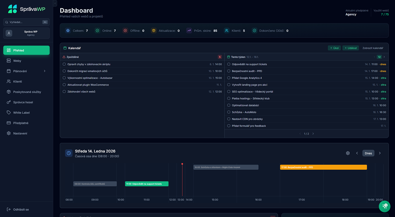 Správa WordPress webů je náročná. My sami jsme roky řešili výpadky, zapomenuté úkoly, roztříštěné přístupy, dohledávání plateb a přepínání mezi desítkami administrací.